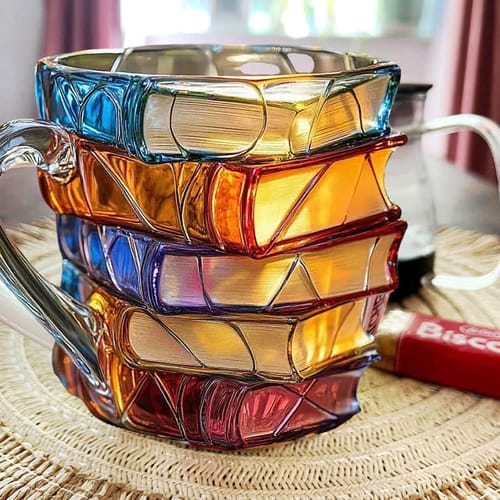 Eine Tasse, die aussieht wie eine kleine Bücherwelt.
