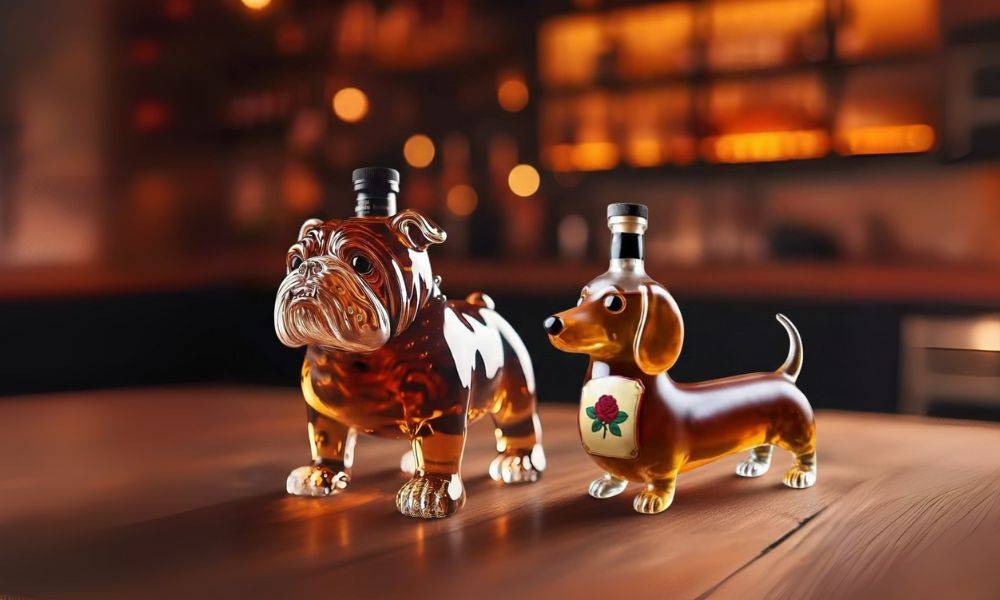 Eine massive, kunstvoll designte Flasche in Form eines Hundes – handgefertigt aus schwerem, klarem Glas.