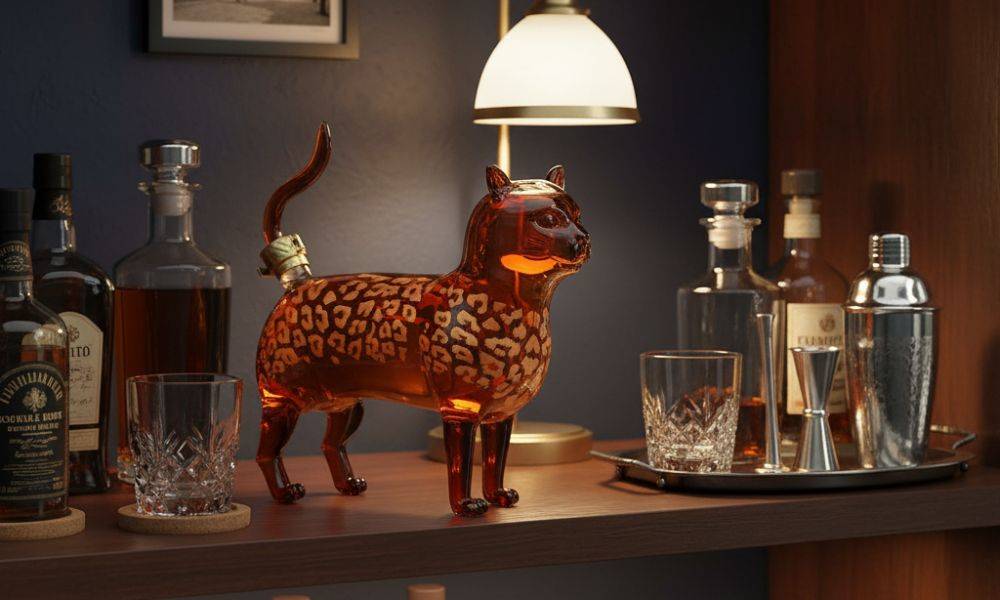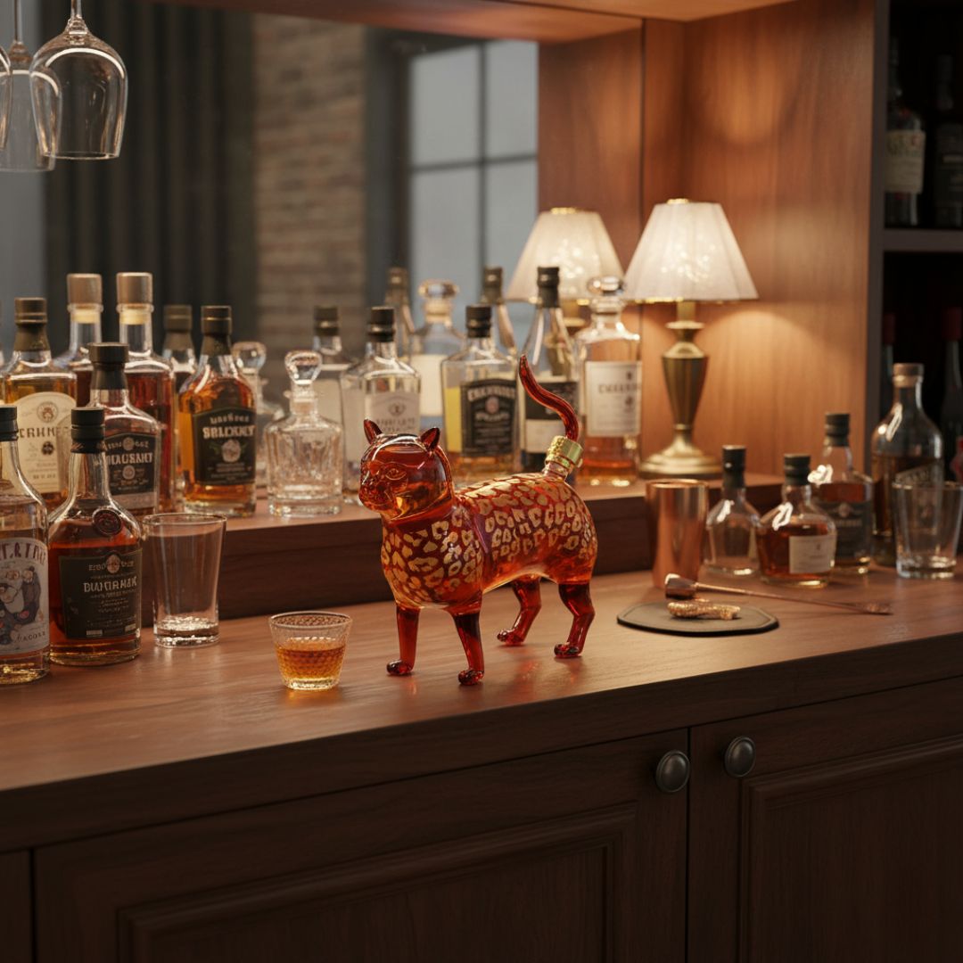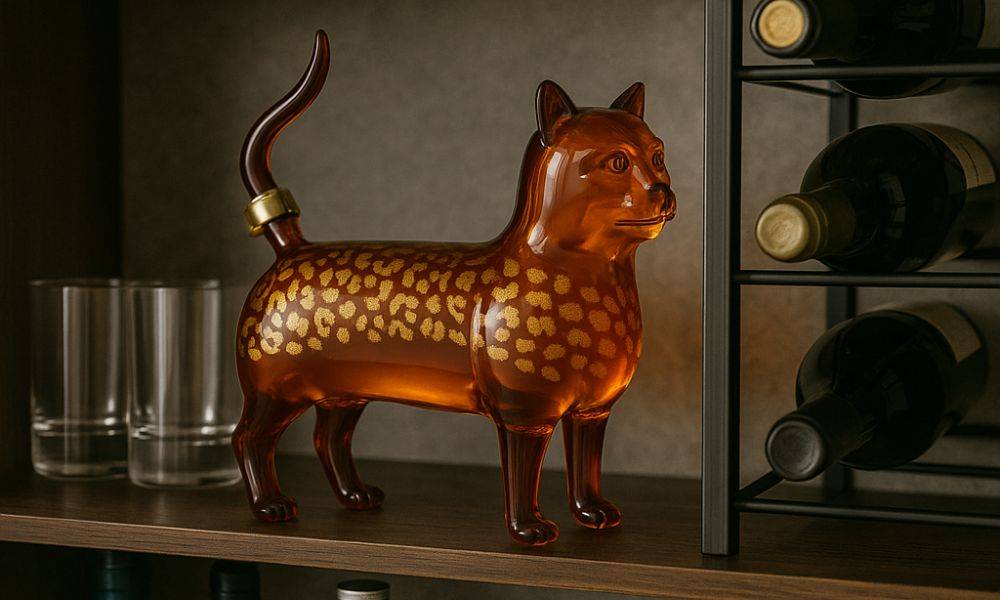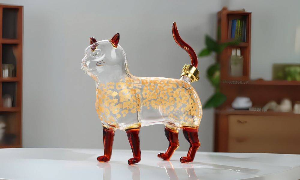 Eine massive, kunstvoll designte Flasche in Form einer Katze – handgefertigt aus schwerem, klarem Glas.