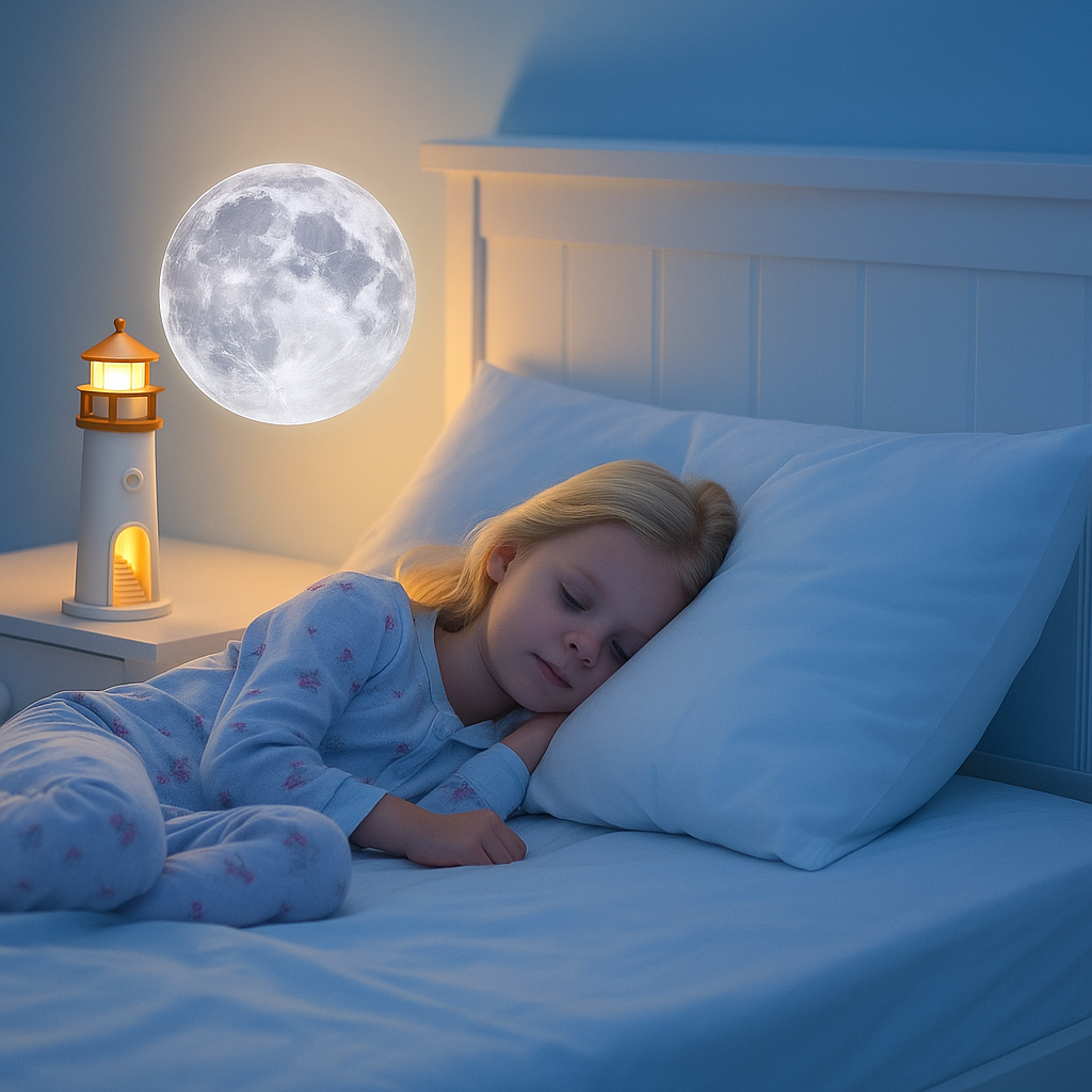 Sie projiziert ein realistisch leuchtendes Mondbild an deine Decke und taucht jeden Raum in eine beruhigende Atmosphäre – inspiriert vom friedlichen Licht eines Leuchtturms, der Menschen nachts sicher nach Hause führt.