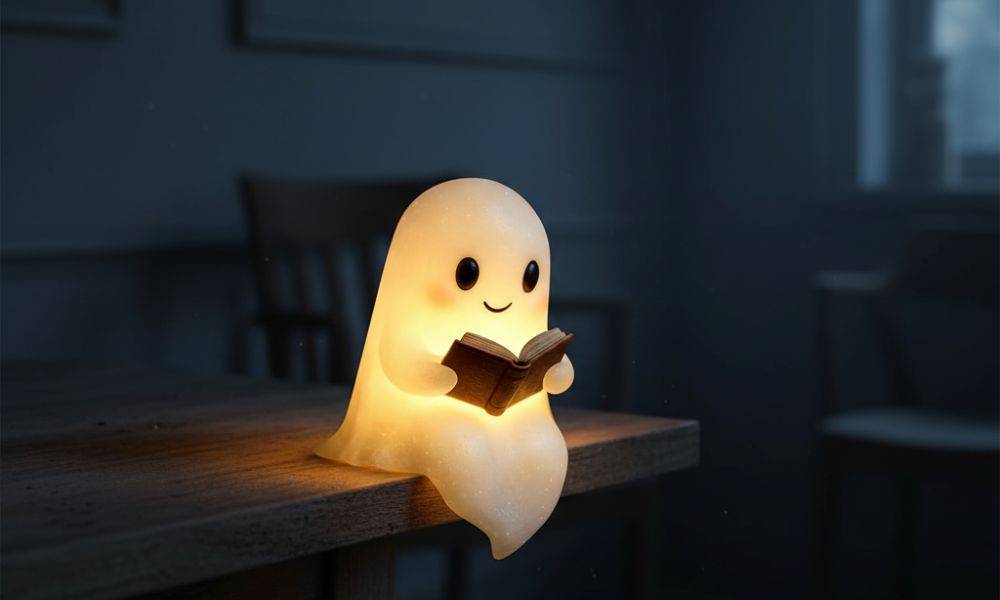 Im Inneren lag die süßeste kleine Geisterlampe, die ich je gesehen habe – sanft leuchtend, glatt wie ein Stein, der von der Sonne gewärmt wurde. In ihren Händen hielt sie ein winziges Buch und sah so aus, als wollte sie mir gleich eine Gutenachtgeschichte zuflüstern.
