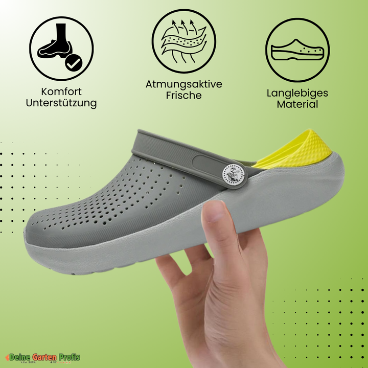 OrthoClogs entlastet Rücken und Gelenke und gibt Ihnen das Gefühl, wie auf Wolken zu gehen, während es gleichzeitig ein Ausrutschen im Alltag verhindert.